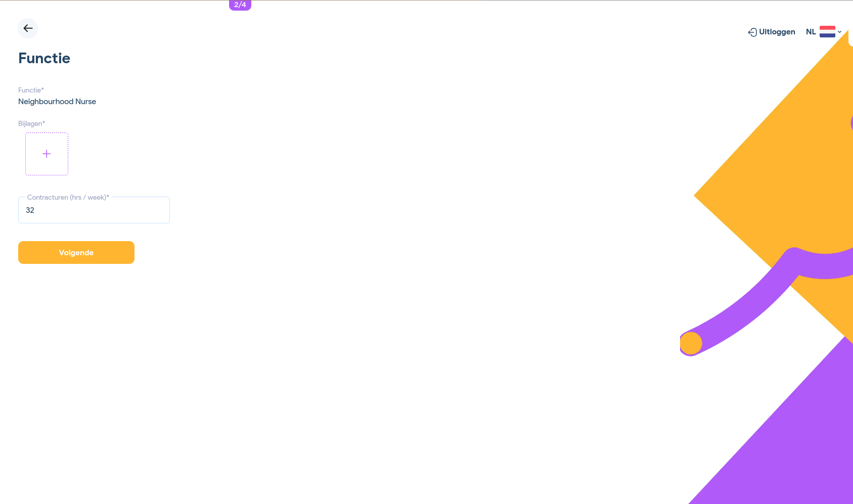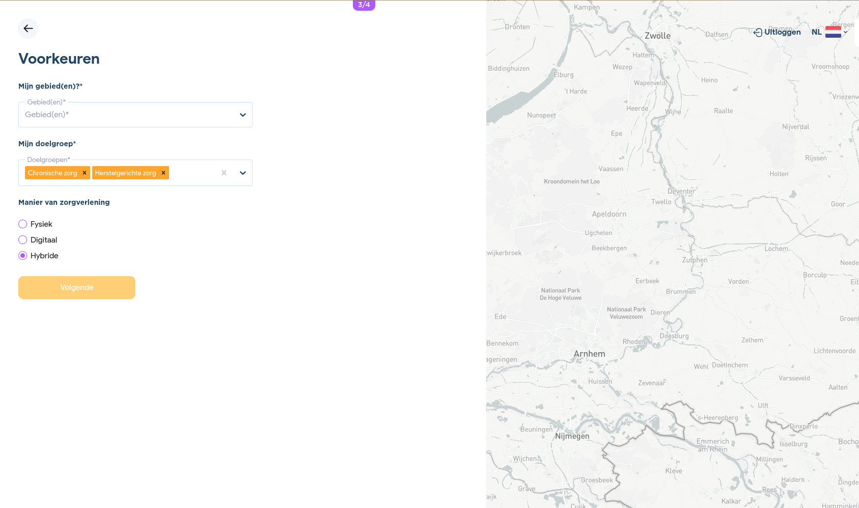 Nadat je jouw functie hebt gecontroleerd en op "Volgende" hebt geklikt, kom je terecht bij jouw voorkeuren. Hier kun je aangeven in welk(e) gebied(en) je wilt werken, welke type zorg je wilt verlenen en op welke wijze je deze zorg wilt verlenen. Van tevoren zijn deze velden al ingevuld door de administratie.