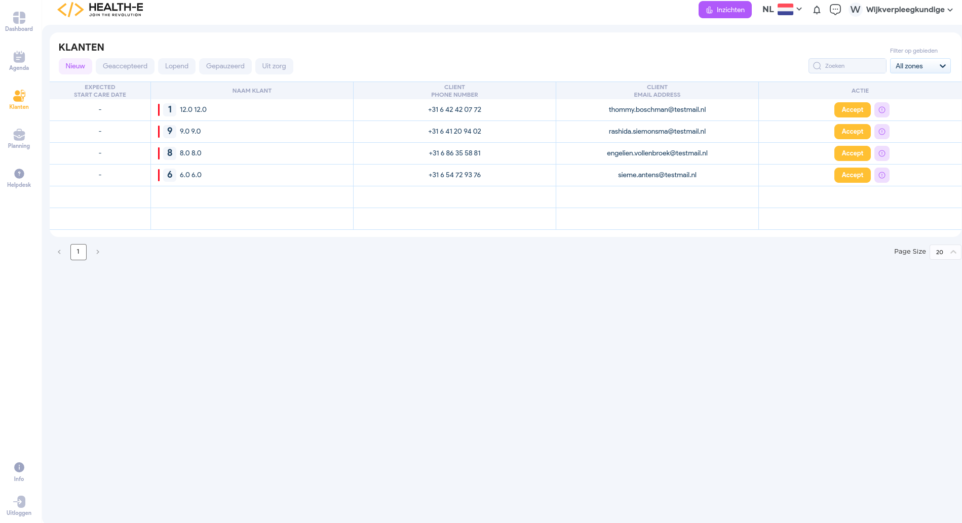 In het "Nieuw" overzicht krijg je de mogelijkheid om klanten te accepteren of af te wijzen met de groene en rode knop. Zodra je een klant hebt geaccepteerd, komt deze in het overzicht "Geaccepteerd" te staan. Hier kun je vervolgens een intake afspraak plannen, zorgleefplan selecteren en een zorgpakket aanmaken.